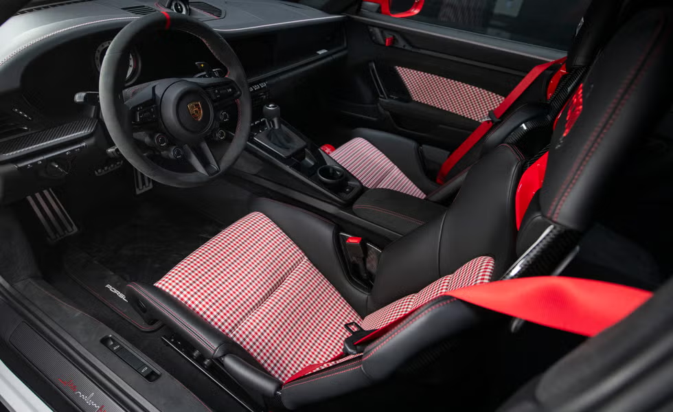车内同样充满加拿大元素:门槛饰板印有多伦多天际线图案,仪表盘采用红白双色缝线,安全带为醒目的红色,座椅则覆盖专为该车定制的红色千鸟格织物。拍卖得主还将获赠一块同款 911 GT3 RS 计时腕表,与爱车完美呼应。